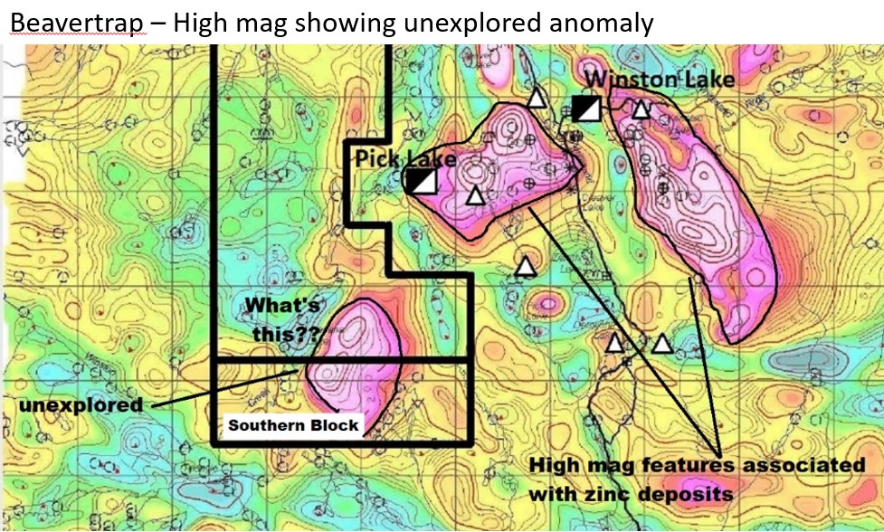 The Beavertrap Lake property has undergone significantly less exploration than the Winston-Pick Lake and Big Duck Lake areas. Multiple high priority airborne mag and EM conductors exist within the property that have never been drill tested. The potential for precious metal and base metal discoveries within the property is considered high.