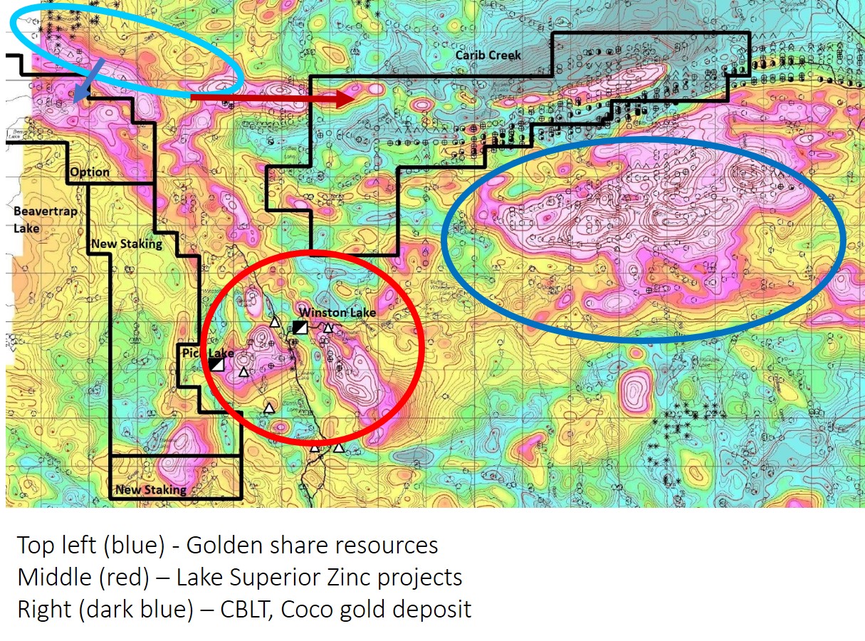 - Golden Share Resources prospecting and sampling identified 400m strike length in the Sandridge-Carib Lake area reporting more than 7% sulphides and Quartz veins and stockworks with up to 20% pyrite on a series of outcrops. The exact width of this zone is undetermined at present but it correlates well with an extensive airborne geophysical anomaly. This anomaly extends eastward through the north end of the Carib Creek property.