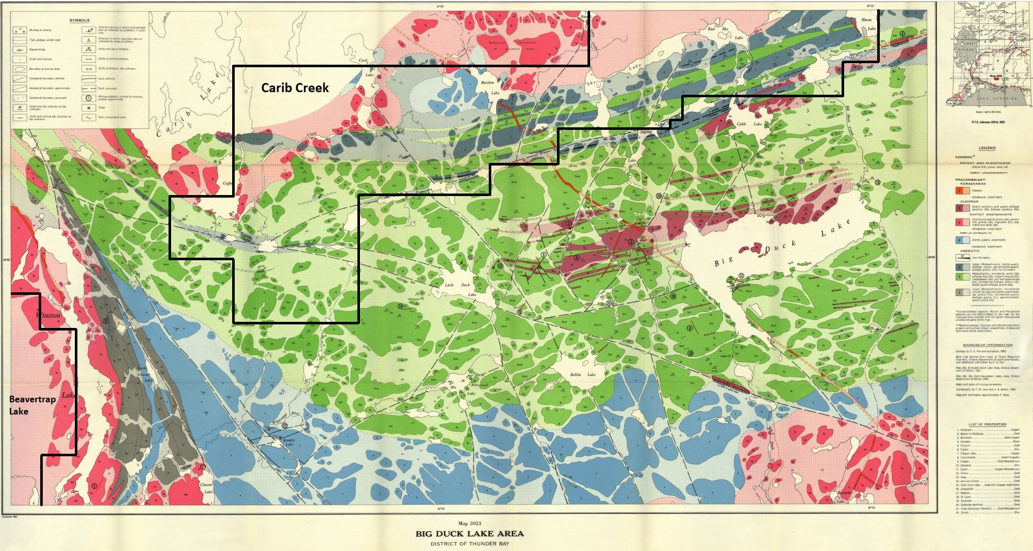 The 89-cell Carib Creek property is located within the northern Wawa terrane in the Archean Superior Province. It is hosted in the Winston Lake Greenstone Belt ("WLGB"), between the Shebandowan Greenstone Belt ("SGB") located to the west and the Manitouwadge Greenstone Belt ("MGB") to the east. All three belts are bounded to the north by the Quetico sedimentary terrane and host notable base metal past producers: