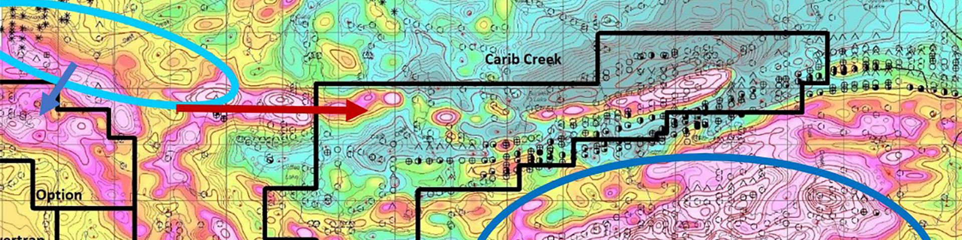 The Carib Creek property has undergone significantly less exploration than the Winston-Pick Lake southwestern domain and the Big Duck Lake southeastern domain. Multiple high priority airborne mag and EM conductors exist within the property that have never been drill tested. The potential for precious metal and base metal discoveries within the property is high.