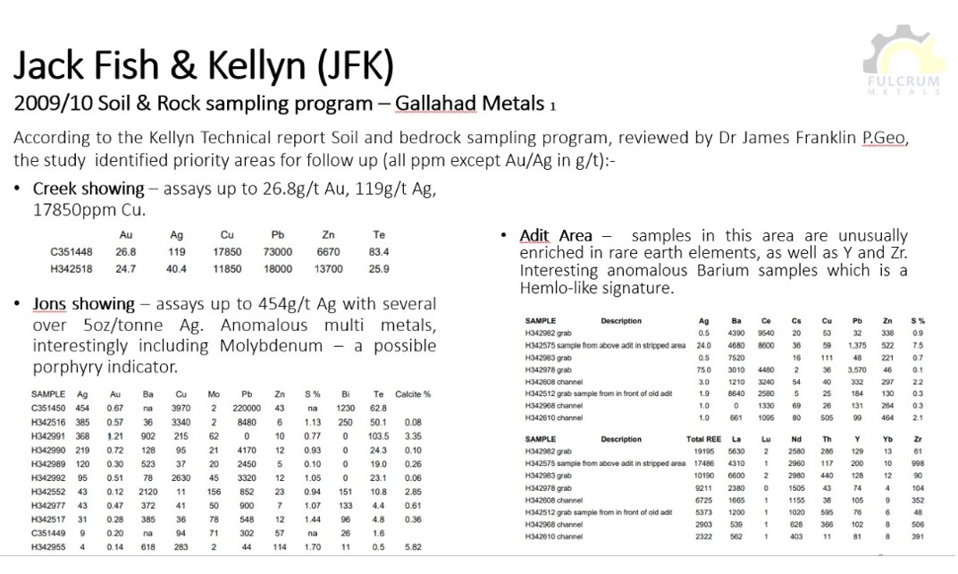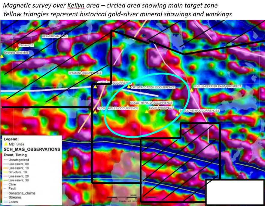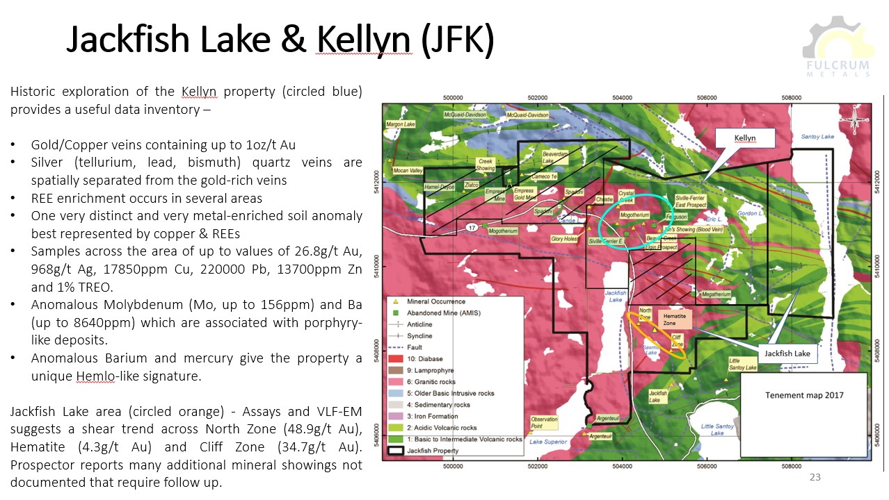 - Kellyn area hosts several REE, gold/base metal workings and occurrences, and a copper-gold soil anomaly, with a geochemical signature possibly analogous to the world-class Hemlo gold deposit, 80 kms to the east.
