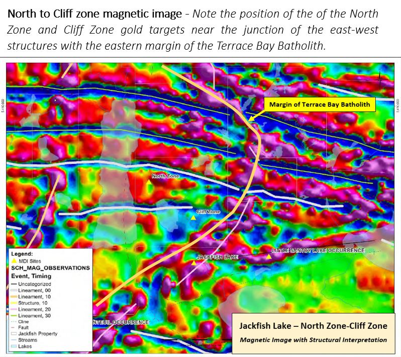 At Jackfish Lake, probable shear-controlled quartz veins bearing high gold grades and lower-order gold occurrences in adjacent granodiorite host rock occur over a significant area near the margin of the Terrace Bay batholith. This suggests that the eastern marginal zone of the intrusive may be similarly prospective to the well gold-endowed western marginal zone. The prospective eastern contact zone has not been systematically explored.