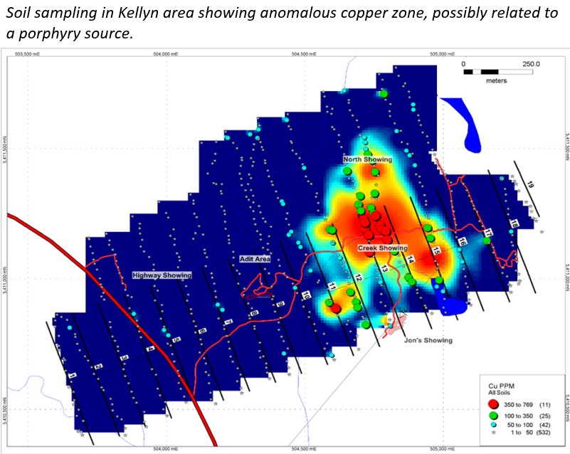 In addition to the bedrock mineralisation at Kellyn, detailed soil sampling has located a complex soil anomaly in an area of no exposure up to 500m north of the main bedrock showings which might represent a porphyry-type target. Anomalous elements in soils include gold, silver, zinc, lead, mercury, molybdenum, antimony and tellurium, with a clear copper-gold association.