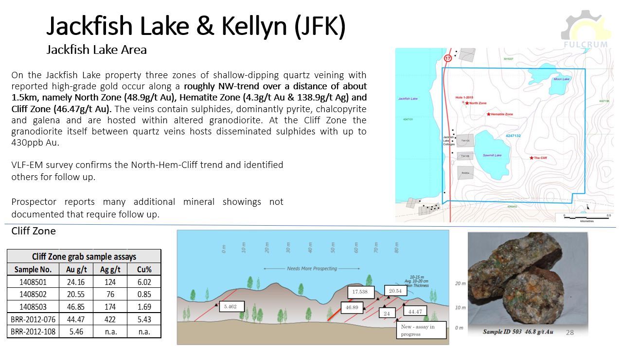 On the Jackfish Lake property three zones of shallow-dipping, altered quartz-carbonate veins and vein stockwork containing high-grade gold values have been discovered along a probable NW shear zone over a distance of about 1.5km. These are North Zone (up to 48.9g/t Au), Hematite Zone (up to 4.3g/t Au) and Cliff Zone (up to 34.7g/t Au). The veins contain suphides, dominantly pyrite, chalcopyrite and galena and are hosted within altered granodiorite. At the Cliff Zone the granodiorite itself between quartz veins hosts disseminated sulphides with up to 430ppb Au.