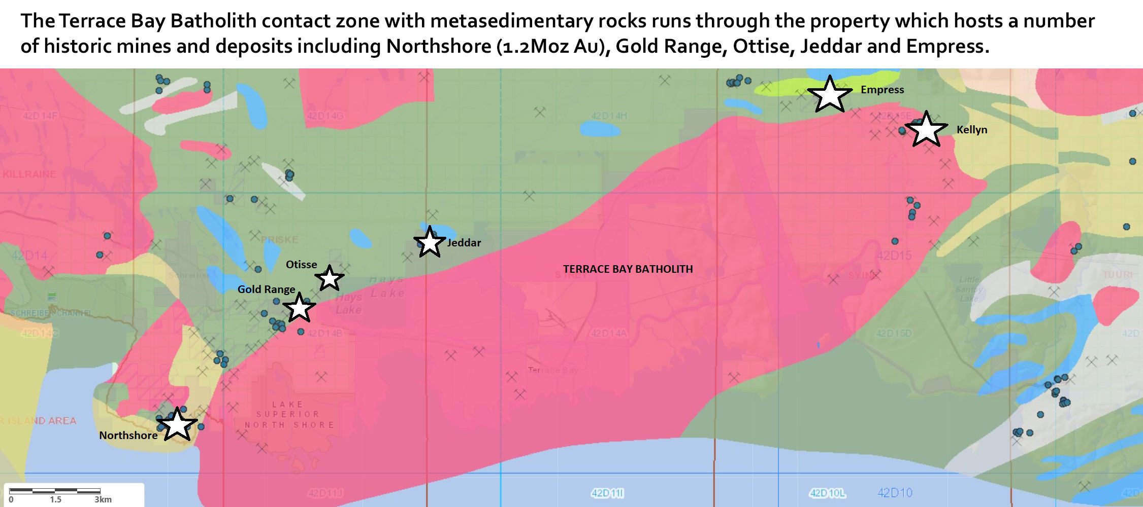 - Straddles the contact zone of the Terrace Bay Batholith with mafic volcanic rocks which host several nearby mines and deposits including Northshore (1.2moz Au), Gold Range, Ottise and Jeddar deposits.