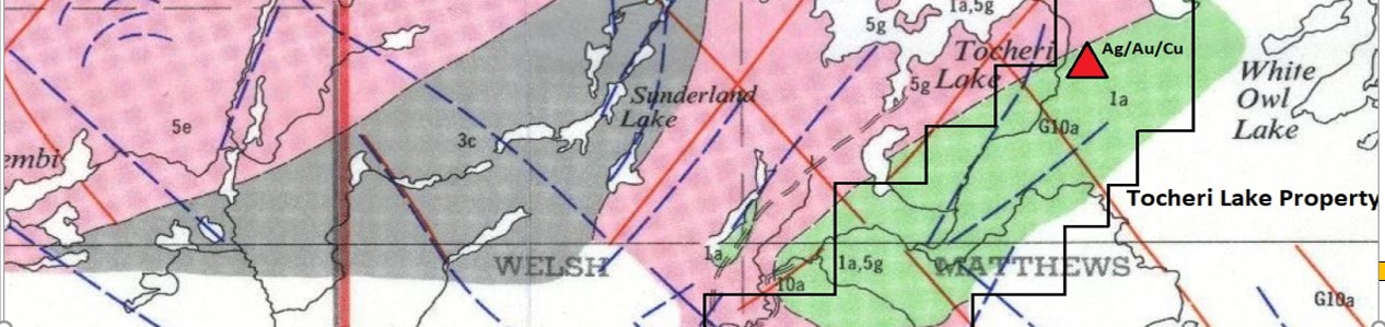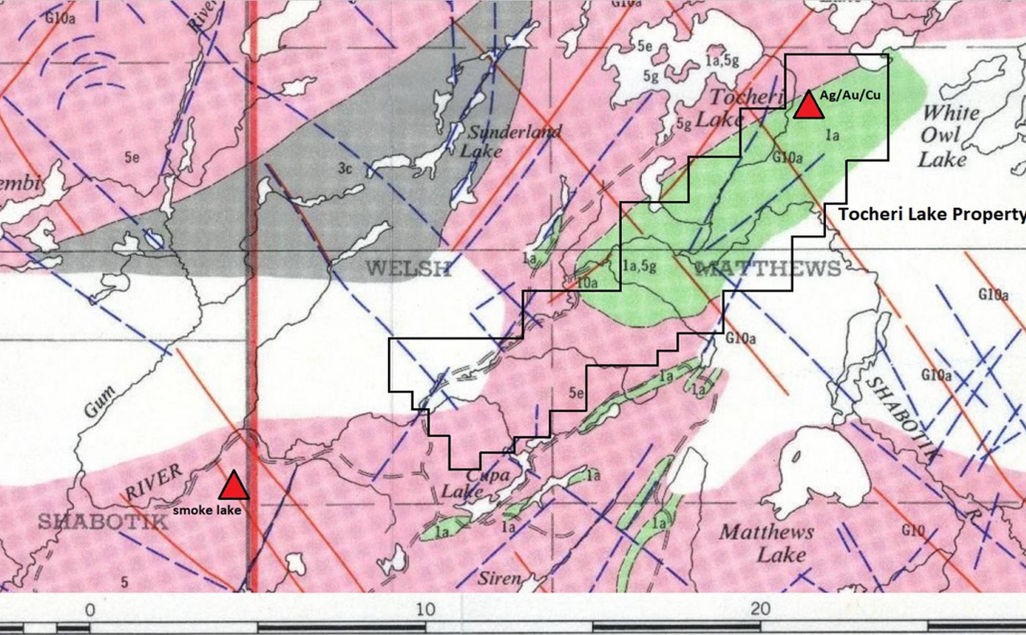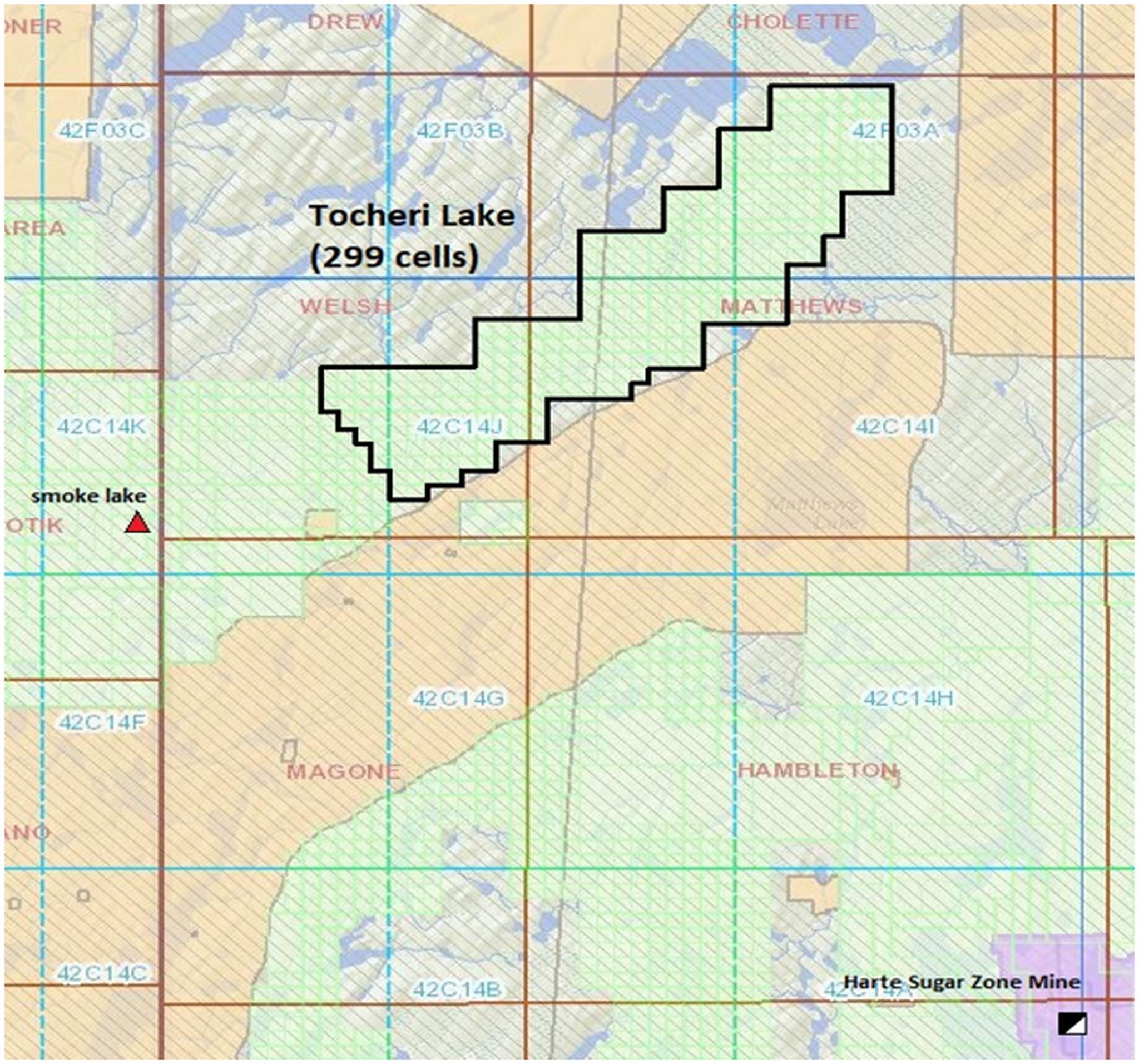 - Tocheri Lake is a 299 cell property ~62.9sqkm located in the Matthews Township occupies an exclusive area of greenstone in the Dayohessarah Greenstone Belt that is relatively unmapped and underexplored.